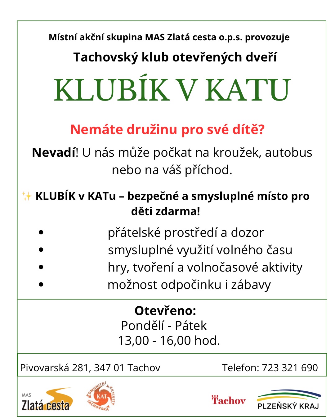 Klub KAT je určen dětem ve věku 6–15 let, které mohou po škole využít bezpečné a přátelské prostředí k čekání na autobus, kroužek nebo vyzvednutí rodiči. Děti zde tráví čas pod dozorem dospělých a mají možnost se věnovat smysluplným aktivitám – hrám, tvoření, povídání s kamarády nebo učení.